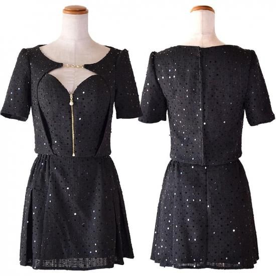 1504スパンコールツイード チェーンパール タイト ミニドレス キャバドレス