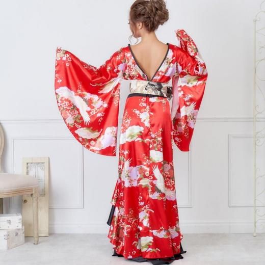 0712サテン和柄フリルロング着物ドレス 衣装 ダンス よさこい 花魁 コスプレ キャバドレス