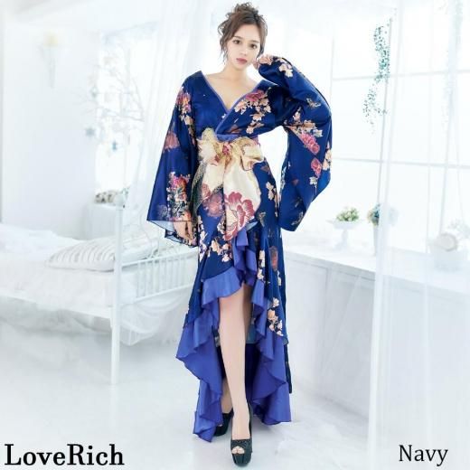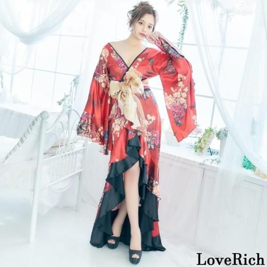 0712サテン和柄フリルロング着物ドレス 衣装 ダンス よさこい 花魁 コスプレ キャバドレス