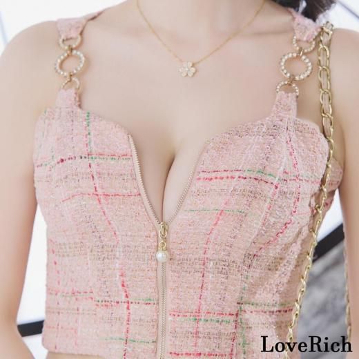 1319ツイード セットアップ パール チェック柄 谷間魅せ スリット タイト ミニドレス キャバドレス