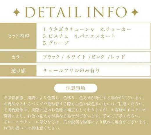 1:うさ耳カチューシャ 2:チョーカー 3:ビスチェ 4:パニエスカート 5:グローブ